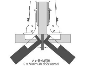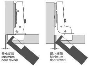 最小間隙指側(cè)面應(yīng)該預(yù)留的空間,以確保門的正常開啟。它取決于杯座距離K,門的厚度和所選擇的鉸鏈類型。門上的圓角,可以減小最小間隙。每種較鏈的最小間隙,詳見表格。