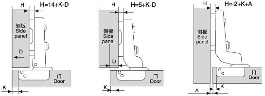 當(dāng)確定了較鏈的最小間隙A后,根據(jù)確定的覆蓋程度D和鉸杯距離K,就能立刻從表格中查出底座高度H,更好的方法是,門的覆益距離D和鉸杯距離K要滿足表中底座高度H的要求。以某一款直臂為例:覆蓋距離D=19mm,鉸杯距離K=5mm,這時從表中查得H=0mm。而產(chǎn)品系統(tǒng)中的確有這種底座。當(dāng)查出的底座高度 H在定貨系統(tǒng)中沒有與之對應(yīng)的產(chǎn)品時,要用鉸臂上的薄蓋距離調(diào)整螺絲來調(diào)整覆蓋距離,以達(dá)到設(shè)計要求。